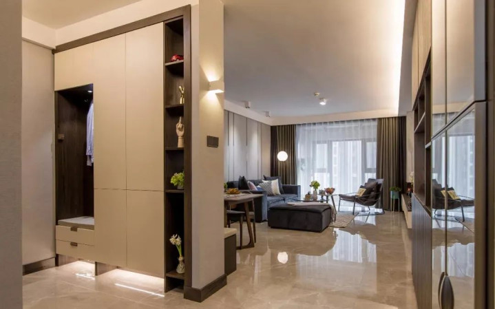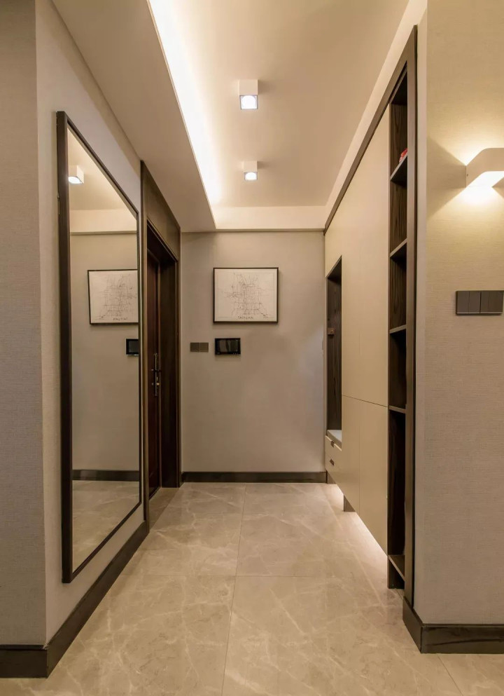 玄关作为入户的第一印象,设计尤为用心。入户柜并非采用满墙封闭设计,而是巧妙预留出中层空格区域,既方便放置钥匙、包包等日常物品,又让空间显得通透不压抑。更贴心的是,柜体下方内嵌了感应灯带,每当主人归家推开门,柔和的暖光便会自动亮起,不仅避免了夜间摸黑换鞋的不便,更用光影营造出温馨的归家仪式感,让轻奢氛围从踏入家门的那一刻便悄然蔓延。