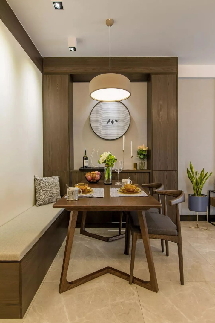 餐厅区域的设计则将空间利用率与美学感做到了平衡。考虑到三居室的居住需求,设计师在餐桌一侧定制了卡座,相比传统餐椅,卡座不仅节省了更多活动空间,还增加了底部的储物抽屉,可收纳餐具、零食等物品,让小户型也能拥有充足的储物能力。卡座的软包选用了浅灰色科技布材质,触感细腻且耐脏易打理,搭配金属质感的餐桌支架与同色系餐椅,精致感十足,无论是日常独自用餐,还是邀请朋友小聚,都能在舒适的氛围中享受美食时光。